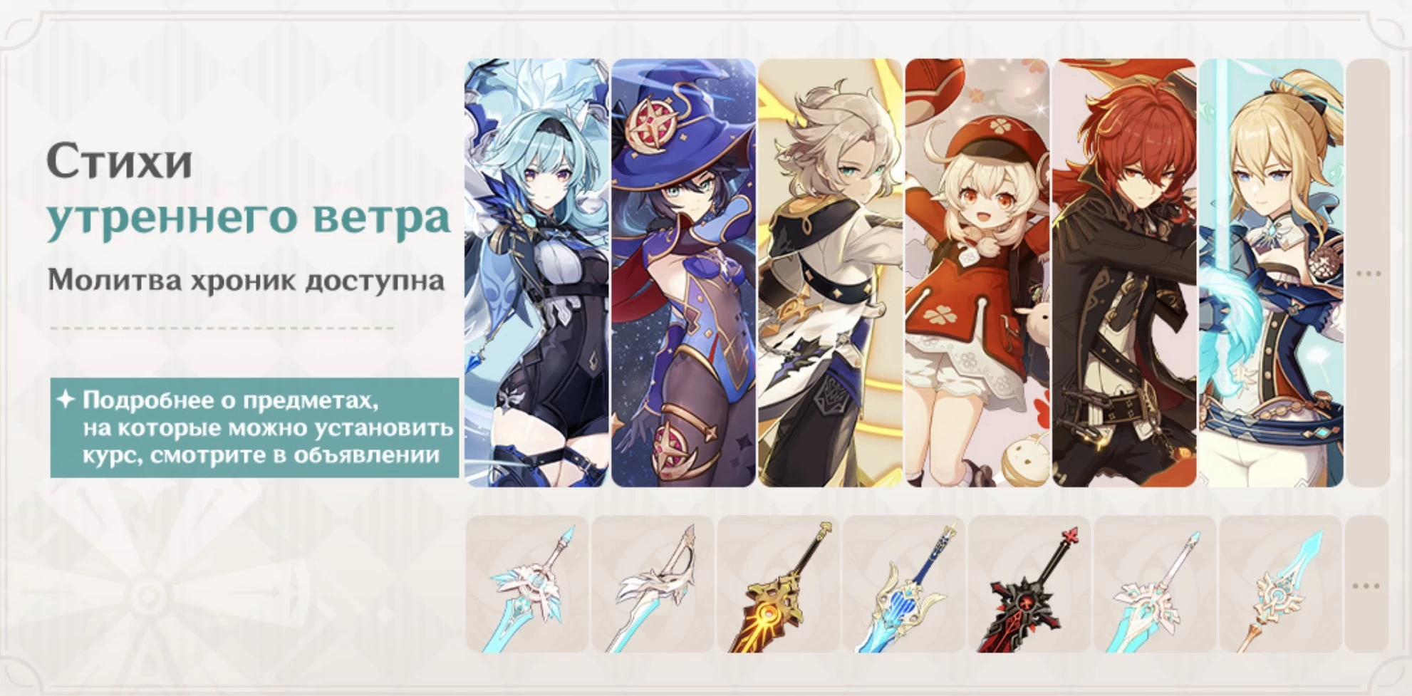 Здесь мы укажем молитвы, которые действовали в прошлом. Для чего это нужно? Дело в том, что разработчики вряд ли будут делать баннеры по одним и тем же героям с перерывом в 2-3 месяца, поэтому, если вы увидели, что по определенным персонажам Мондштадта уже выпускали баннер, то не следует ожидать их появления в ближайших молитвах хроник.