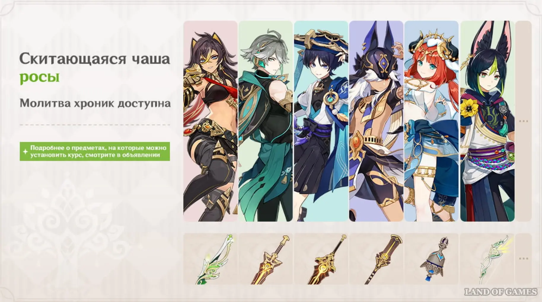 - Скитающаяся чаша росы (с 10 по 30 сентября 2025 года): Дэхья (Пиро), аль-Хайтам (Дендро), Странник (Анемо), Сайно (Электро) и Нилу (Гидро); Свет лиственного разреза (Одноручное), Ключ Хадж-нисут (Одноручное), Маяк тростникового моря (Двуручное), Посох алых песков (Древковое), Воспоминания Тулайтуллы (Катализатор) и Охотничья тропа (Стрелковое).