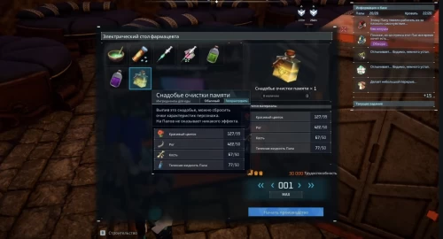 Итак, первым делом вам необходимо будет открыть Электрический стол фармацевта (доступ к нему разблокируется лишь на 43-м уровне) и установить его на базе. Затем взаимодействуйте с ним и в меню выбора рецептов нажмите на нужное снадобье. Для его производства вам понадобятся рога х50, кости х50, красивые цветки х99 и телесная жидкость Пала х50.