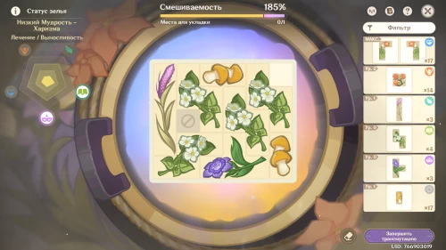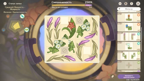 Все наши зелья подходили под спрос, поэтому мы решили сделать экспертный эликсир на будущее, например, на Харизму, Благоухание и Мастерство, использовав для этого маркот, сумерскую розу и ветряную астру. Вариант размещения ингредиентов продемонстрирован на изображении ниже.