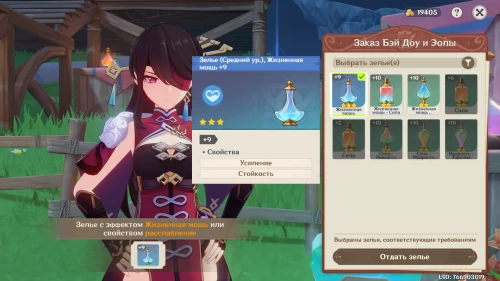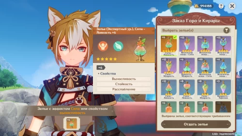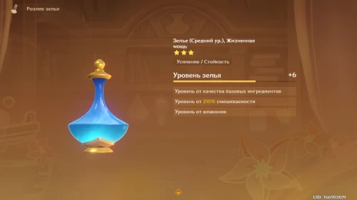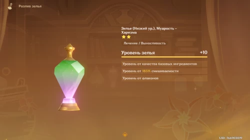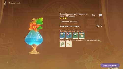 Если вы отдали Дилюку уже имеющееся у вас зелье, то вы можете изготовить другой эликсир для удовлетворения рыночных запросов. Мы решили сделать продукт на Стойкость, Усиление и Выносливость, использовав для этого лилии калла, цветки-сахарки и конские хвосты. На скриншоте ниже показан итоговый результат.