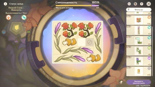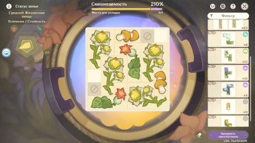 Мы решили сделать зелье на Силу и Ловкость, чтобы удовлетворить сразу два рыночных запроса. Для этого мы в основном использовали персик зайтун и туманный цветок. На изображении ниже показано примерное размещение ингредиентов. Вероятнее всего, вы получите 15-й уровень алхимии. Отныне вы сможете готовить неограниченное количество зелий в каждом цикле и выполнять быструю трансмутацию.