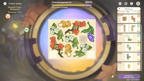 Если же вы хотите получить все награды, то используйте: ламповый колокольчик х4, ветряную астру х1, сумерскую розу х2, ягоды и грибы (заполните ими свободные ячейки). Вариант размещения ингредиентов показан на картинке ниже. В результате вы создадите зелье экспертного уровня и получите 100 тысяч средств.