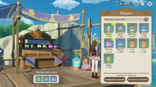 Затем бегите к торговой лавке и выставите на продажу созданные зелья. Отметим, что одинаковые эликсиры продавать одновременно нельзя, поэтому придется выбрать только один вариант. В конце подойдите к столику, за которым сидит Лиза, и завершите текущий день. Если вы все сделаете по гайду, то за первый день заработаете около 8-9 тысяч средств.