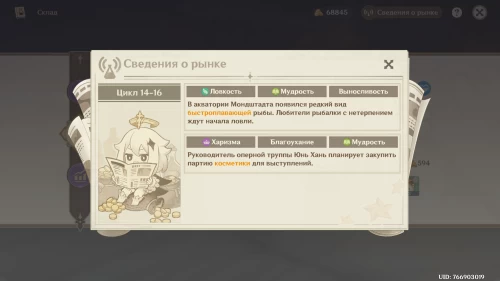 - В акватории Мондштадта появился редкий вид быстроплавающей рыбы. Любители рыбалки с нетерпением ждут начала ловли. Требуется зелье на Ловкость, Мудрость, Выносливость и/или Сосредоточенность.