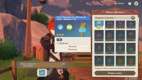 Неожиданно к вам придет Дилюк, которому потребуется зелье на Жизненную мощь и Мудрость или Сосредоточенность и Расслабление. Отметим, что если вы ранее уже изготавливали подобное зелье, то можете сразу же передать его владельцу винокурни, потратив трансмутацию на другой эликсир.