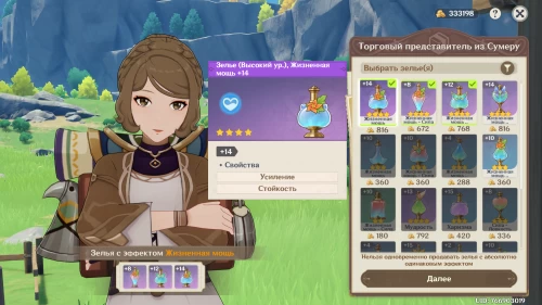 Идите к Фреде и купите у нее Стабильный рост продаж III и Тщательный анализ III. Тем самым вы разблокируете все доступные усиления. Затем соберите ингредиенты и приступайте к созданию зелья. Мы решили сделать эликсир на Жизненную мощь, Мудрость, Усиление и Лечение. Для этого следует использовать цветок-сахарок и цветок цинсинь. Пустые места заполните грибами или ягодами.