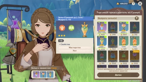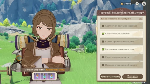 Улучшите имеющиеся зелья, а затем расставьте на прилавке нужные эликсиры (скорее всего, придется обновить весь ассортимент). Не забудьте также пообщаться с вернувшимся торговым представителем из Сумеру. Передайте ему 3 зелья на Ловкость, а затем выберите те же стратегии, что и раньше. Можете завершить торговый цикл.