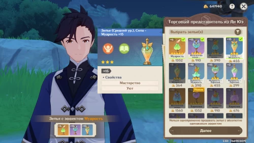 Если же готового продукта нет, то мы советуем вам изготовить зелье, либо из лилий калла и цветков цинсинь, либо из ягод, одуванчиков и персиков зайтун. На скриншоте ниже мы показали неплохой вариант эликсира на Сосредоточенность и Расслабление. Отдайте его Дилюку для получения награды в размере 65 тысяч средств.