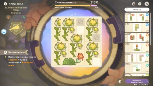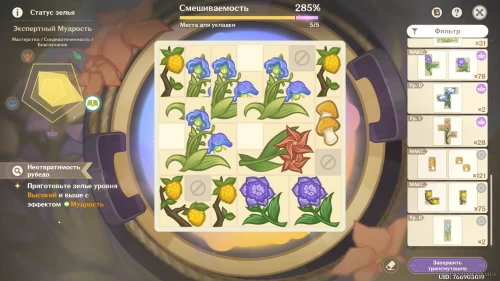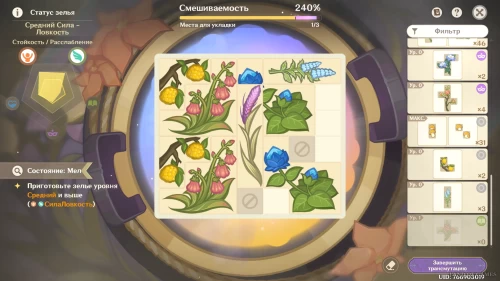 Для выполнения программы минимум используйте 1 персик зайтун, 1 туманный цветок, 2 мяты и 4 ягоды. Если вы хотите изготовить максимально эффективное зелье с выполнением всех второстепенных целей, мы рекомендуем использовать следующие ингредиенты: персик зайтун х2, туманный цветок х2, ягоды х2, мята х1 и конский хвост х1 (можете по-разному комбинировать указанные материалы для получения нужного вам результата). Итоговый вариант показан на изображении ниже.