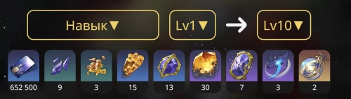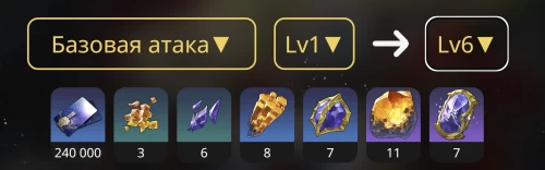 На картинках ниже демонстрируются материалы и их количество, необходимое для максимальной прокачки базовой атаки, навыка, сверхспособности и таланта.