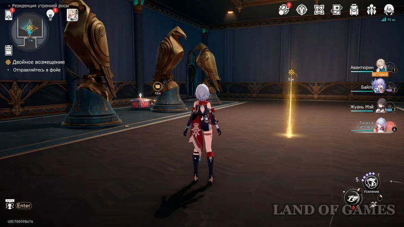 За 14-м ценным сундуком поднимайтесь по мостику недалеко от выставленных в углублении стены экспонатов: попав на стену, бегите к месту битвы с сильными противниками (ее всегда отмечают на карте). Задействуйте в бою персонажей всех типов урона, кроме Квантового (к нему нет уязвимостей) – и награда ваша.