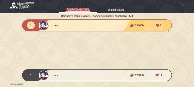 - Звездный нефрит (по 60 штук за вклад) — за 100 тысяч, 400 тысяч, 1 миллион, 2,2 миллиона, 3,8 миллионов, 4,6 миллионов, 5,4 миллиона