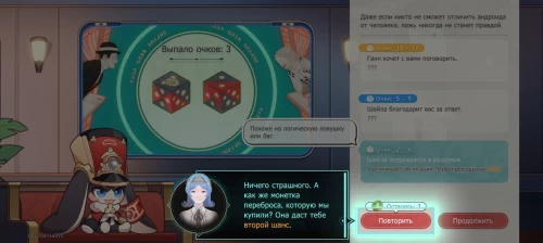 Во второй ход вы попадете на клетку события с Шейлой Нова. Вы можете выбрать любой ответ, после чего придется вновь кинуть кубик. Вам не повезет, и Мэг расскажет о монетке переброса, которая поможет вам добиться лучшего результата.