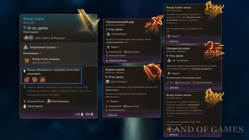Чтобы выбрать верный режим атаки, ориентируйтесь на пользу для отдельной боевой ситуации. Благодаря свойствам скилла «Песня», меч принесет повышенный бонус союзникам с приоритетными модификаторами Мудрости, Интеллекта и Харизмы.