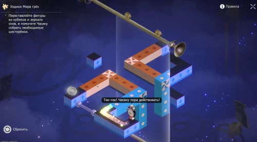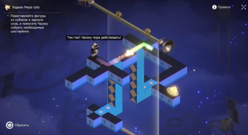 Подвиньте желтую горизонтальную фигуру вниз, а вертикальную – вправо. Затем нажмите один раз на синюю фигуру, чтобы Часик смог дойти до первой детали. Далее поверните зеркало вправо до конца, опустите синюю фигуру, а желтые верните на свои прошлые места. Не забудьте потом снова поднять синие кубики.