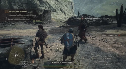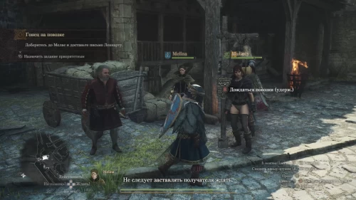 Здесь дождитесь повозку, заплатите извозчику 100 монет и отправляйтесь в деревню Мелве, где вы ранее уже бывали. Перед этим можете также взяться за выполнение квеста «Гонец на повозке», выдаваемого Донованом, стоящим рядом со столбом ожидания тележки. После прибытия в поселение, войдите в его разрушенную часть, и вы увидите, как местные сражаются с дрейком.