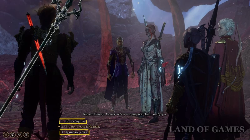 Орфей может избежать трансформации в двух случаях: если это сделаете вы, либо Карлах. Чтобы наша напарница-тифлинг решилась на такой шаг, отвечайте так:
