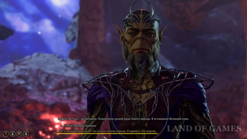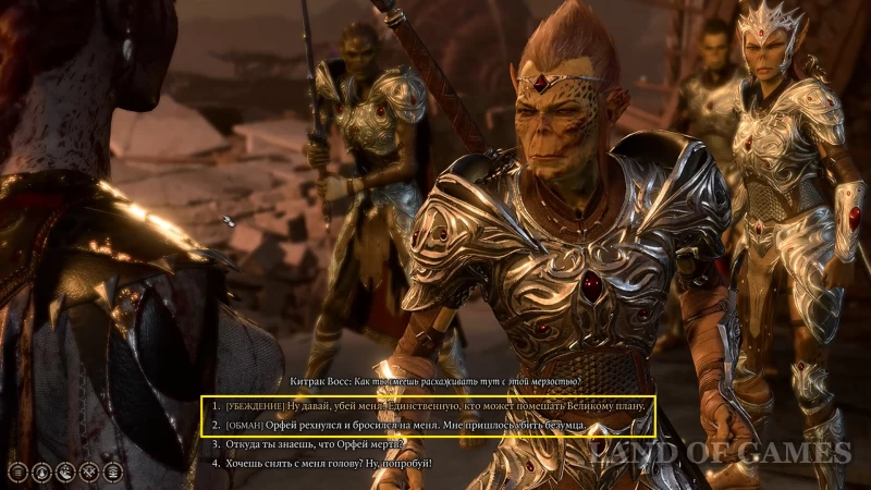 Спасение Орфея сделает сцену после победы более наполненной, ровно, как и финал Лаэзель: гиты получат возможность свергнуть Влаакит и возродить расу под правлением истинного короля. Но это только если он сам не станет иллитидом, иначе для принца гитьянки конечный исход будет не таким радужным: он захочет умереть от ваших рук, а отговорить его можно только после успешного прохождения проверки.
