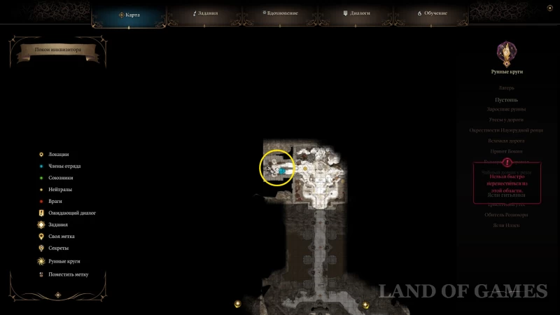 От главного входа двигайтесь прямо, а затем вправо до места с рунным кругом. В конце коридора с телепортом расположен проход в кабинет командира гитьянки, Китрак Террезин, — через него мы сможем попасть в покои инквизитора.