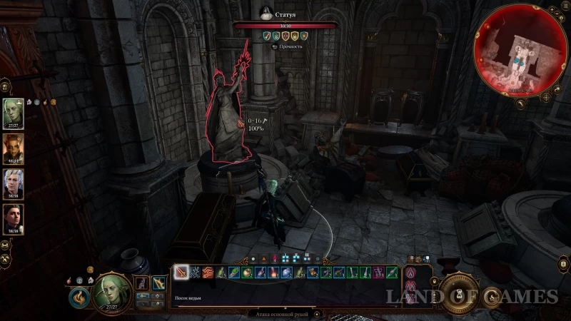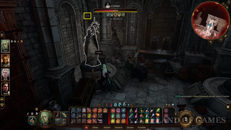 Но если ваши персонажи провалят испытание, обнаружится, что статуя заела. Тогда вам нужно ударить достаточно увесистым оружием, от которого по монументу пройдет как минимум 10 единиц урона. Достаточно одного удара — у статуи всего 30 ХП и она может разрушиться, если вы не рассчитаете силы.
