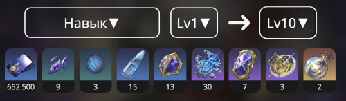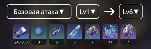 На картинках ниже демонстрируются материалы и их количество, необходимое для максимальной прокачки базовой атаки, навыка, сверхспособности и таланта.
