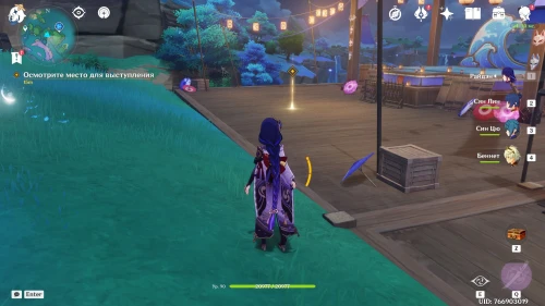 Поболтайте с Куки Синобу и Аратаки Итто, а затем встретьтесь с друзьями, решившими поучаствовать в празднике, – вы найдете их неподалеку. После беседы с ними отыщите Дворжака на площадке чуть ниже.