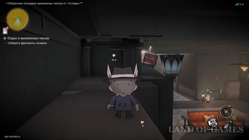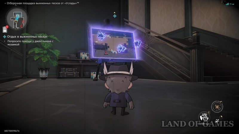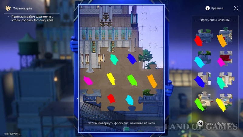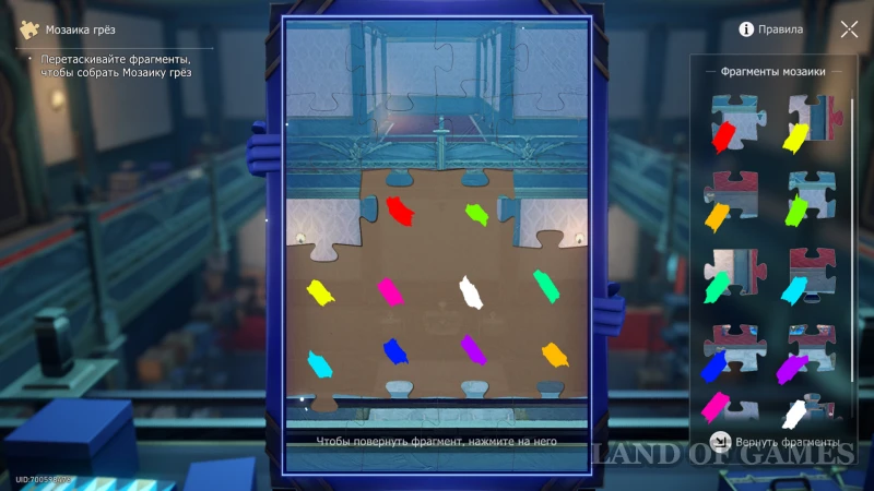 Подойдите к Горюющей хранительнице сокровищ, ожидающей вас на юго-востоке секретного испытания, а после разговора поднимитесь по Сферомету на крышу слева. Здесь вас ждет загадка с Мозаикой Грез. Расставьте пазлы по местам (подсказка на скрине выше), и вернитесь к аппарату перемещения.