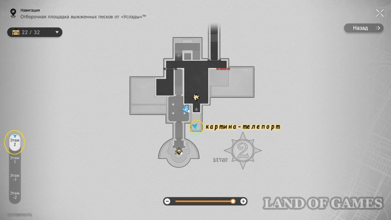 Заметьте, что картина стоит за подъемником на 2-м этаже. Вы можете спуститься на лифте вниз, а затем подняться обратно пешком (по лестнице через зал с 21 ларцом).