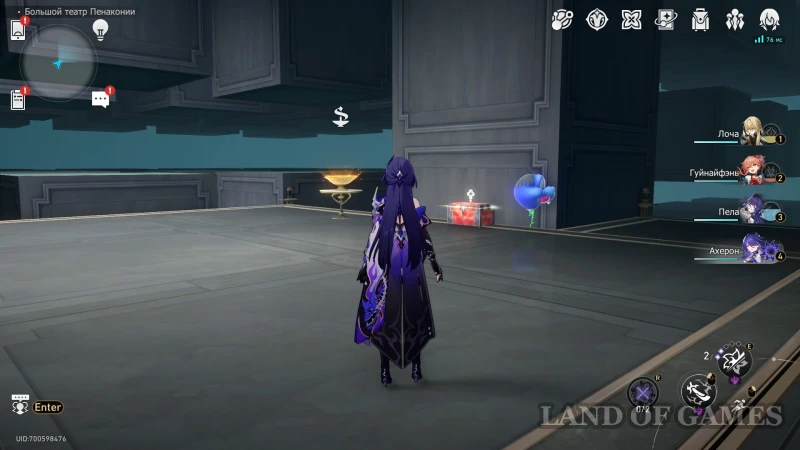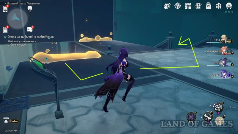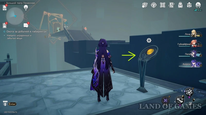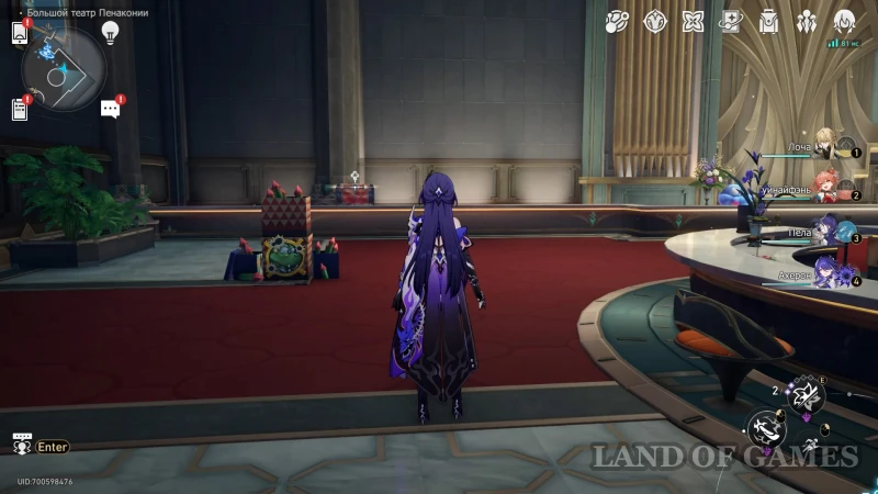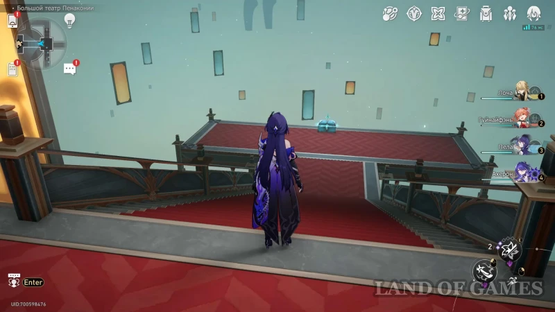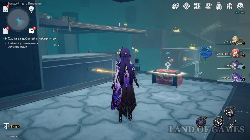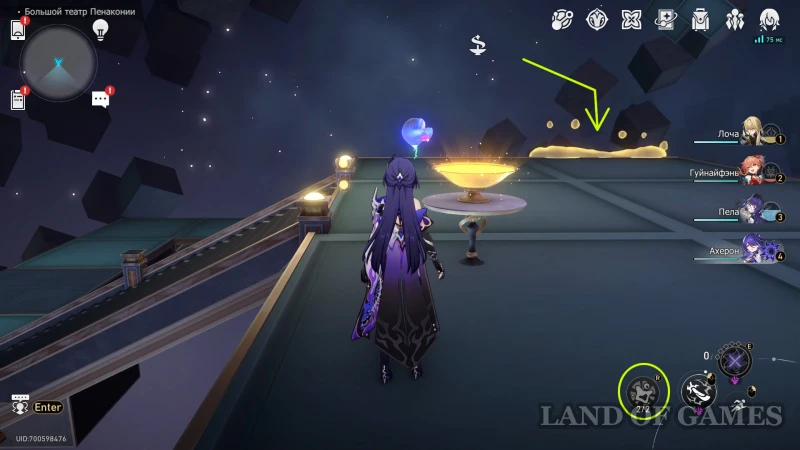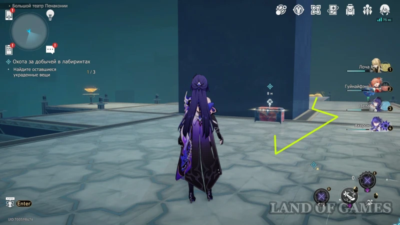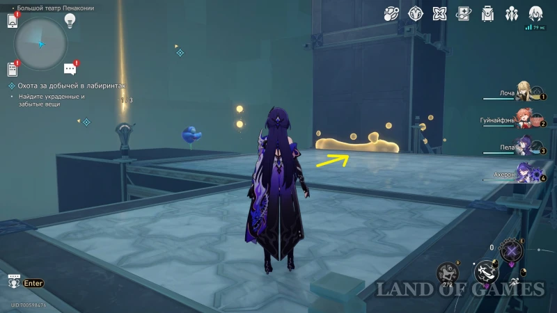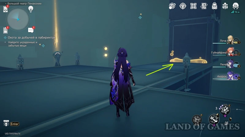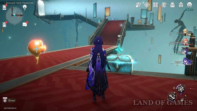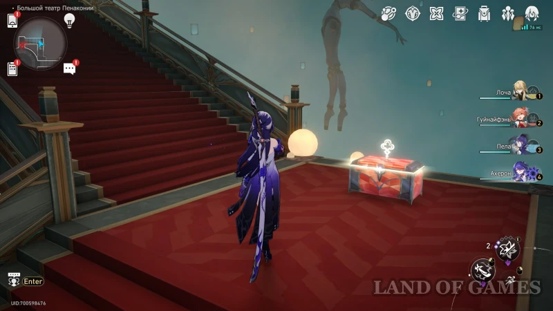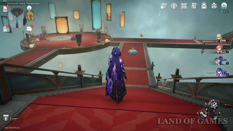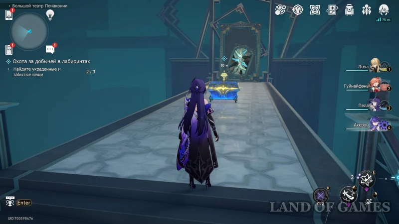 Теперь перейдем в восточную часть карты: сверните за ближайший занавес справа от якоря «Зал гармонизации». На входе, справа от мобов, стоит баннер с джентльменом в шляпе, а перед ним — обычный сундучок.