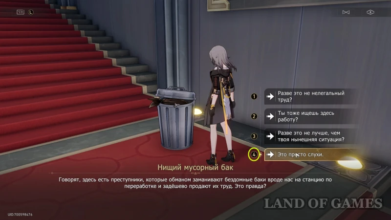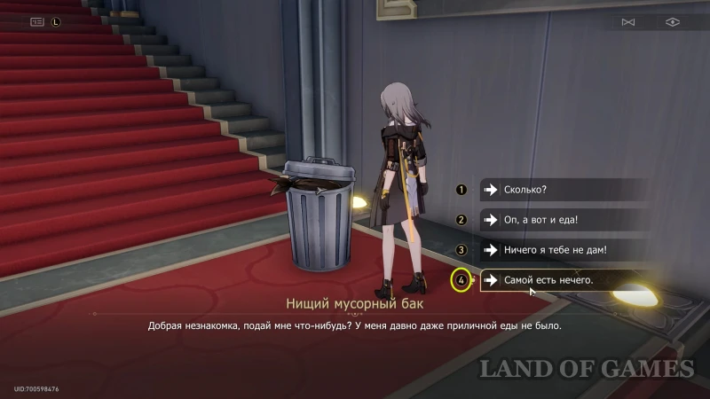 Поверните камеру влево — в промежутке между лесенками побирается Нищая мусорка. Чтобы не обидеть беднягу, отвечайте так: