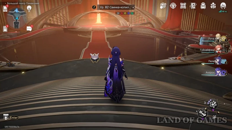 Двигайтесь на север до главного зала: сразу за входом, на спуске, стоит свинка-копилка. Подберите для битвы с ней героев Мнимого, Квантового, Физического, Огненного и Ветряного типов урона, чтобы успешно собрать награду за поимку.