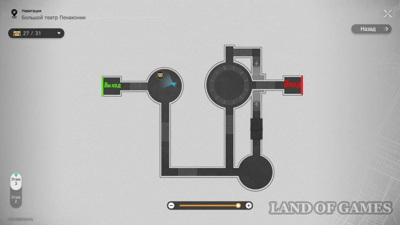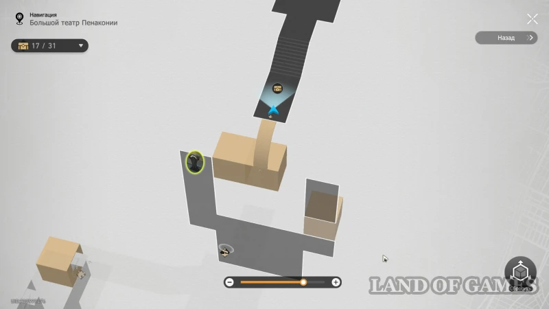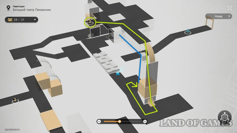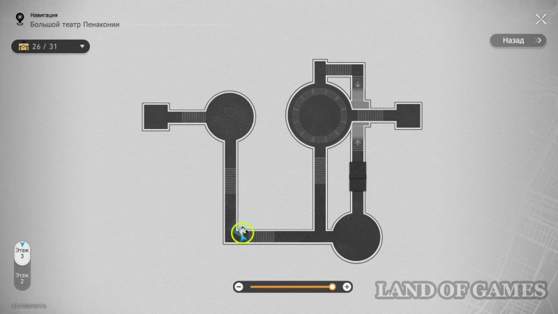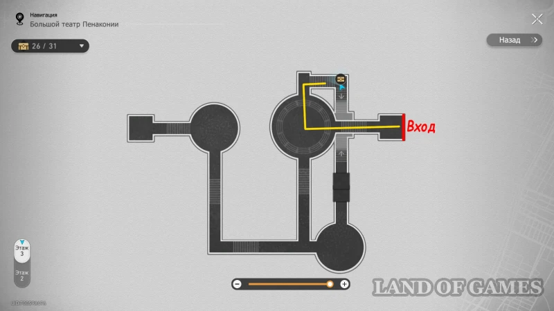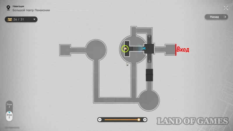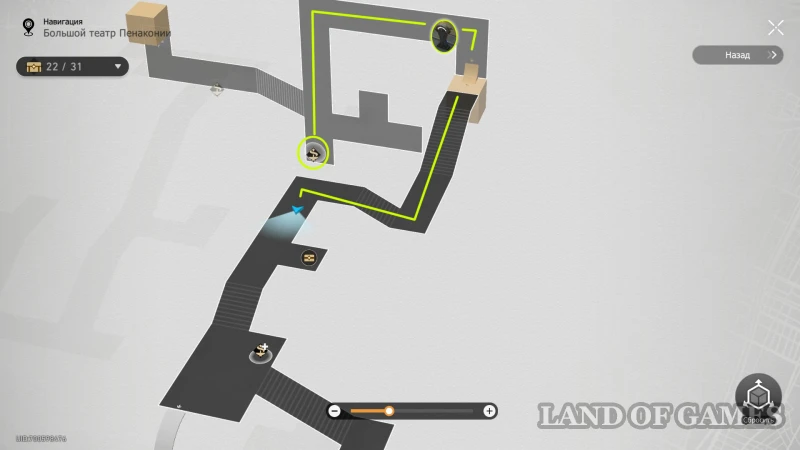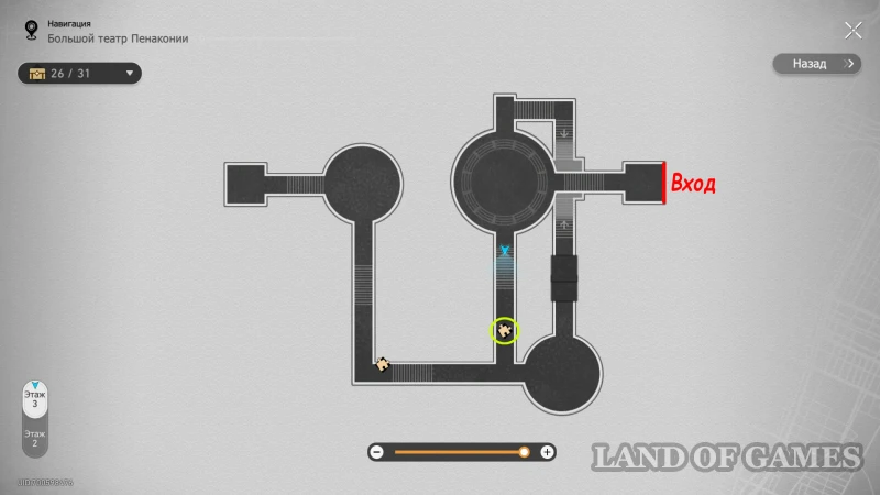Вход к следующей 3D-карте, названной «Ода глупцу», находится в комнатке с 13-м сундуком, на северо-западе Большого театра. В этом пространстве можно собрать награды 21-25.