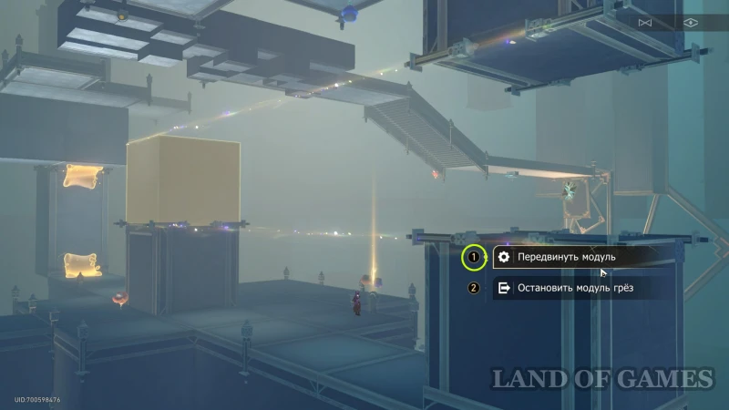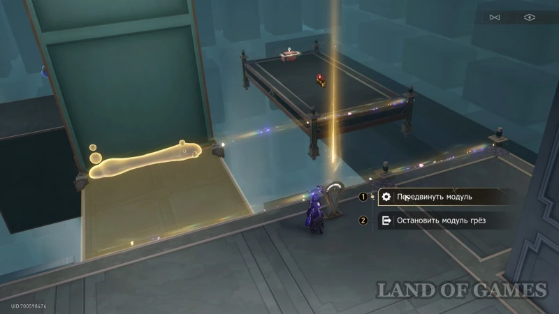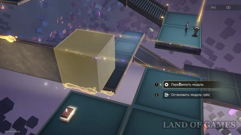 Остается обойти прошлый участок до второго модуля и разместить куб перед ним — появится золотистый сгусток, по которому можно пройти к выходу из трехмерного пространства. В сюжетке на этом месте нас ждет ценный сундучок.