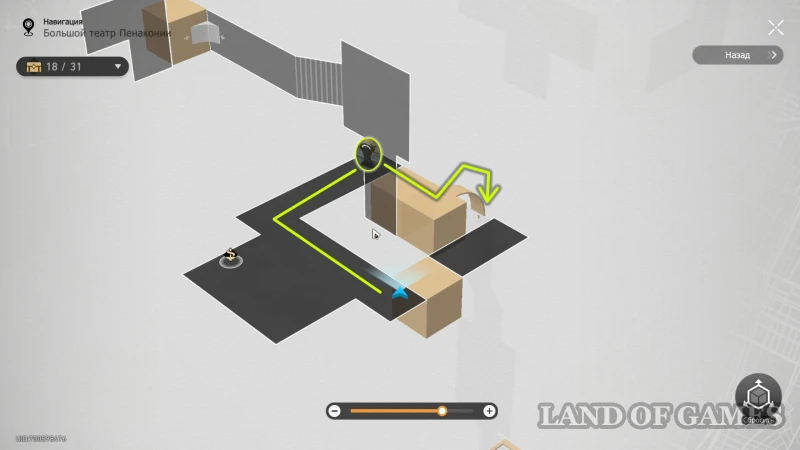 На месте, к которому нас привел предыдущий маршрут, можно воспользоваться еще одним аппаратом для перемещения конструкций — сдвиньте с его помощью куб так, чтобы он примкнул к тропинке перед 29-м сундучком.