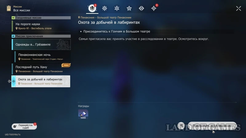 В восточном крыле Большого театра находится Приключение Хану, но просто так его не пройти. Просмотрите непрочитанные сообщения на телефоне и найдите смс от незнакомца, который приглашает вас пройти Последнюю игру — так можно начать квест «Последний путь Хану».