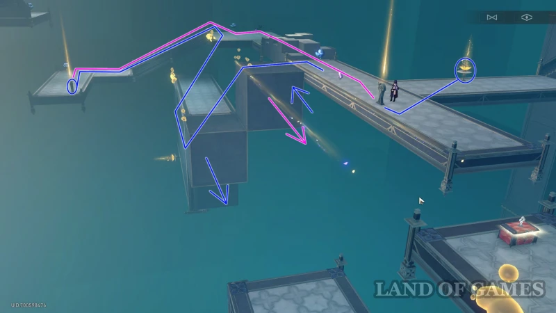 Путь к 26-у сундуку находится справа от входа: пополните запас мемории и бегите к мостику, указанному на скриншоте выше. Этот переход приведет к участку с наградой.