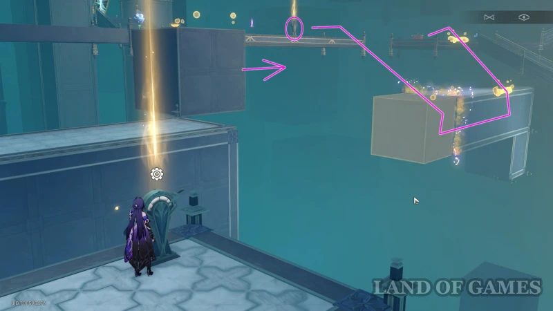 Воспользуйтесь механизмом для пополнения заряда пузырьков, следом подойдите к модулю передвижения элементов пути и сместите с его помощью каменный куб в правую часть карты. Далее поднимитесь вверх и бегите влево, до еще одного фонтанчика. Пополните с его помощью меморию и активируйте ближайший мостик — этот путь ведет к 17-у ларцу.