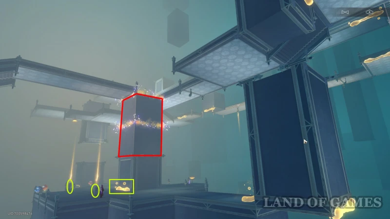 На месте с прошлой наградой находится еще один модуль: его нужно переключить так, чтобы каменный куб стоял справа. На стыке появится сгусток мемории, по которому можно подняться дальше. Обязательно пополните 2 заряда пузырьков и двигайтесь через появившийся проход до зоны с третьим фонтанчиком — около него стоит обычный ларец.