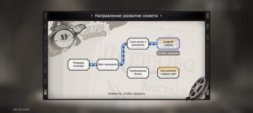 Используйте кубик продолжения истории, чтобы перейти к последней серии, «Наступление сладких грез». В ней Часик расскажет, что Хану успешно одолел босса Камня, Кошмаровиль стал Грезавилем, а Часик, Зеркало и Револьвер покинули «Компас».
