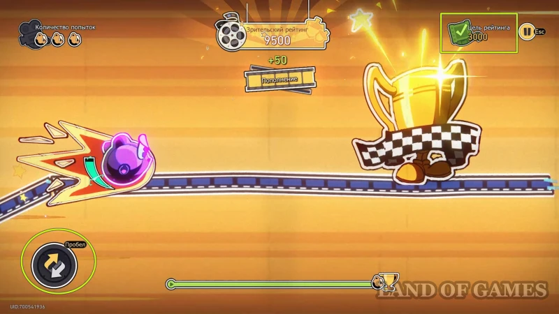Подойдите к кинокамере и примите участие в испытании за скоростного хомяка, динамично передвигая его между верхней и нижней сторонами маршрута, попутно собирая золотые жетоны. Вам нужно добрать 3 тысячи очков, но это несложная задача — на пути очень много монеток и герой почти без перерыва будет двигаться в ускоренном режиме, не теряя жизни от столкновения с конусами. Отметим, что если вы соберете все все предметы «Услады» в испытании, то разблокируете достижение «Чем выше скорость, тем больше сахара в крови».