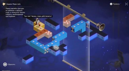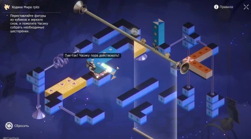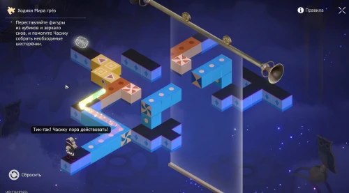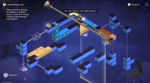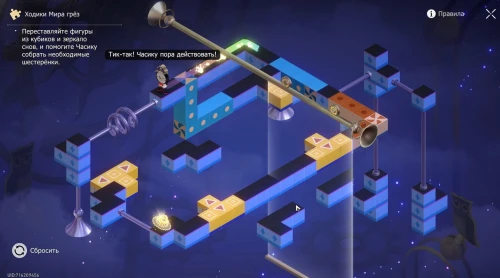 Поверните синюю нижнюю фигуру 3 раза, а красную – тоже 3 раза. Затем подвиньте зигзагообразную фигуру влево до самого конца, чтобы Часик смог пройти к первой фигуре. Теперь просто поверните синюю нижнюю фигуру 2 раза, и персонаж доберется до второй шестерни.