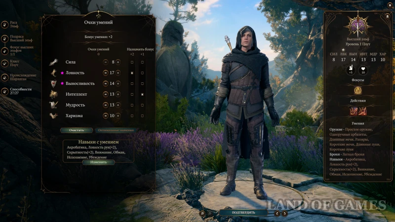 Основные умения Плута держатся на параметре «Ловкости» и вытекающих из нее навыков. Первым делом сосредотачивайте прокачку на ней, а уже потом на «Выносливости» и «Интеллекте». Последний дает бонус к спасброскам против волшебства и подойдет для билдов с магическими способностями, так как влияет на их урон и шанс попадания.