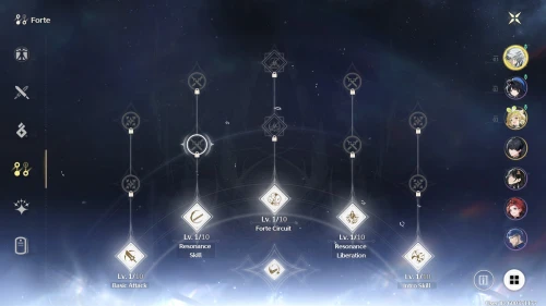 - Цепь Форте (Forte Circuit) – способность, которая определяет игровой процесс персонажа, так как уникальна для каждого резонатора. В игре она представлена в виде дополнительной шкалы, находящейся над полоской здоровья. Узнать, что она стала доступна для использования, можно по изменившемуся цвету (он окрасится в элемент героя) и приобретению иного вида, напоминающего форму звуковой волны. У разных бойцов эта способность активируется различными методами.