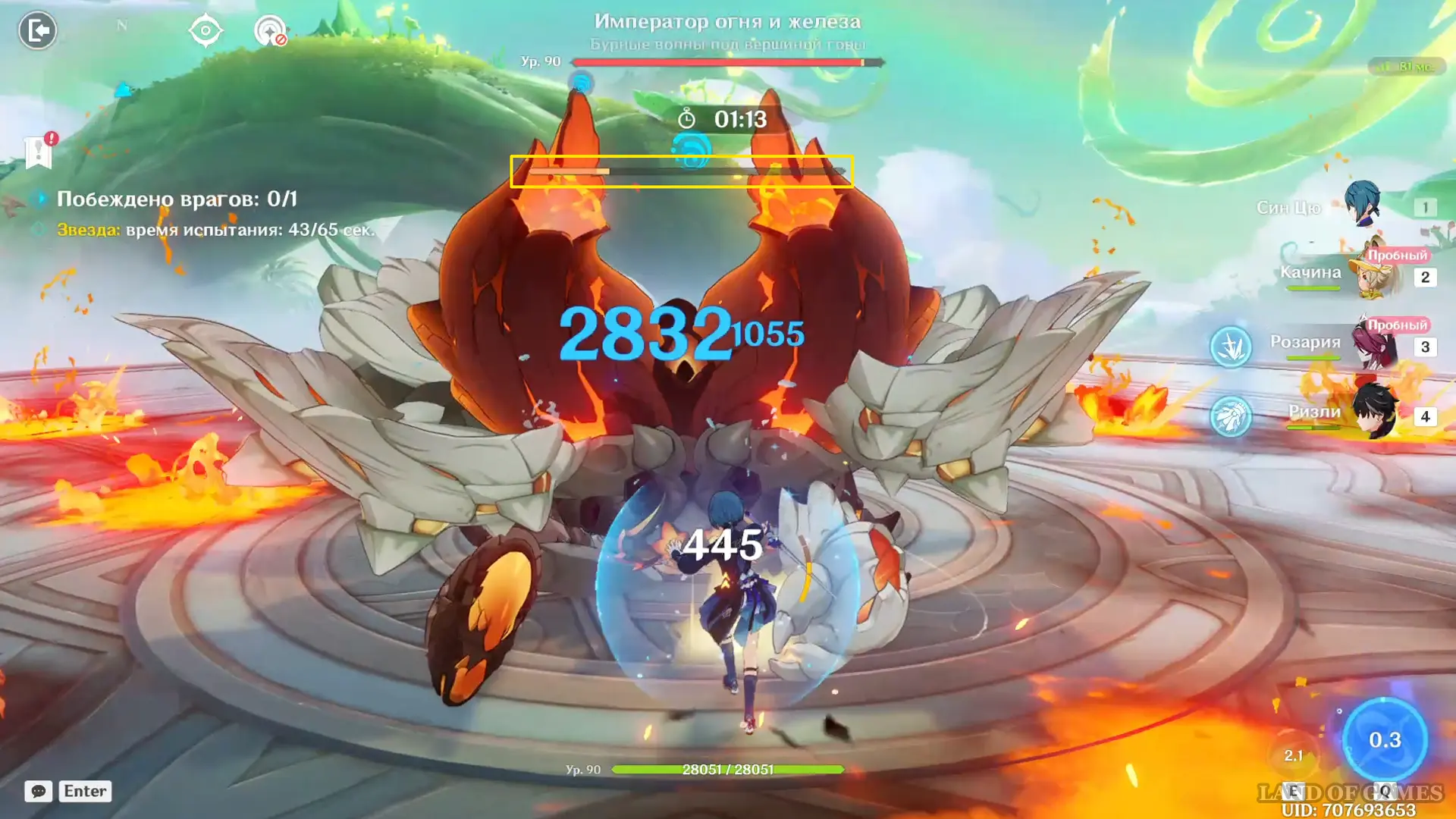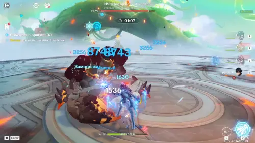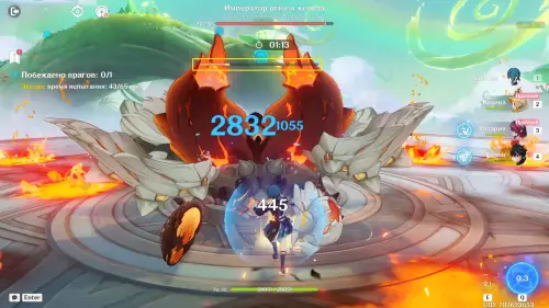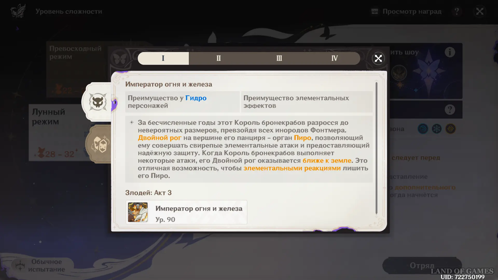- Сцена 3: Император огня и железа. Сбивайте усиление противника гидро атаками и вносите основной урон в моменты, когда краб оглушен и без панциря;