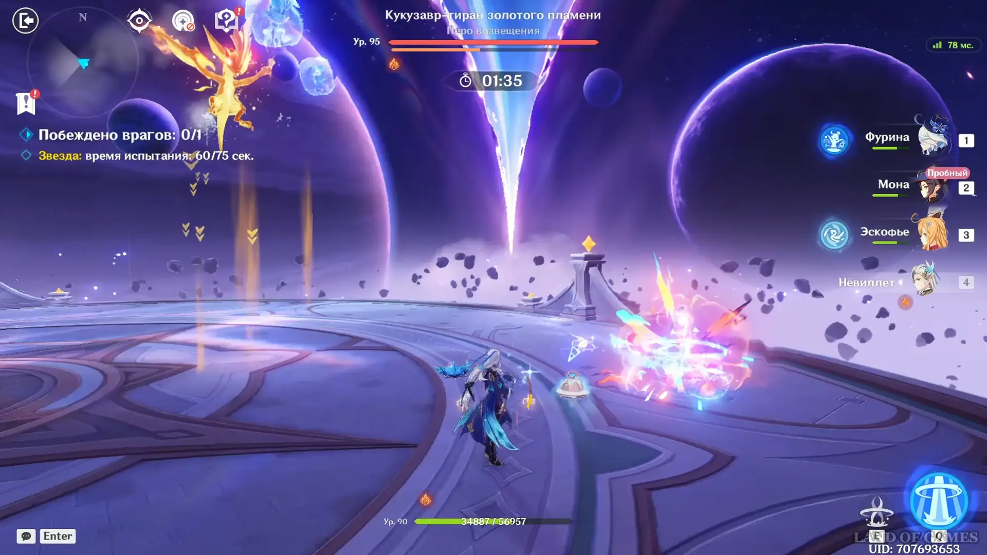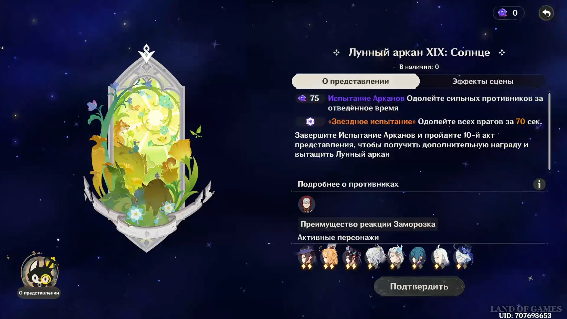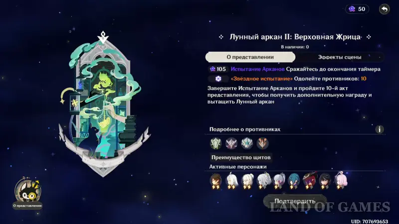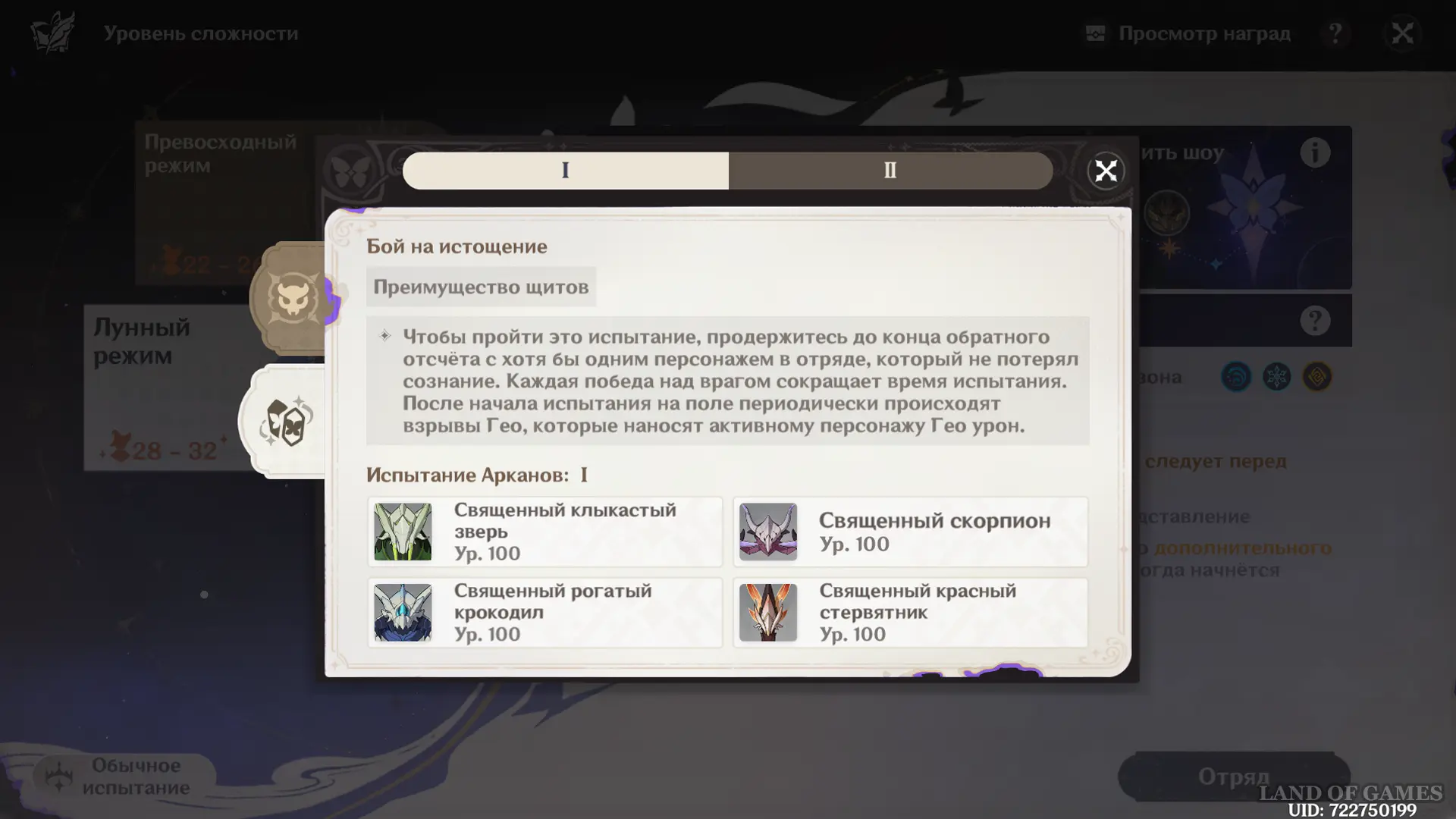 В первом аркане нужно продержаться 6 минут против Священных зверей 100 уровня. Каждое устранение сокращает таймер на 30 секунд, а для звезды требуется победить 10 врагов. На арене периодически происходят элементальные всплески, наносящие урон активному персонажу — щит полностью блокирует этот урон.