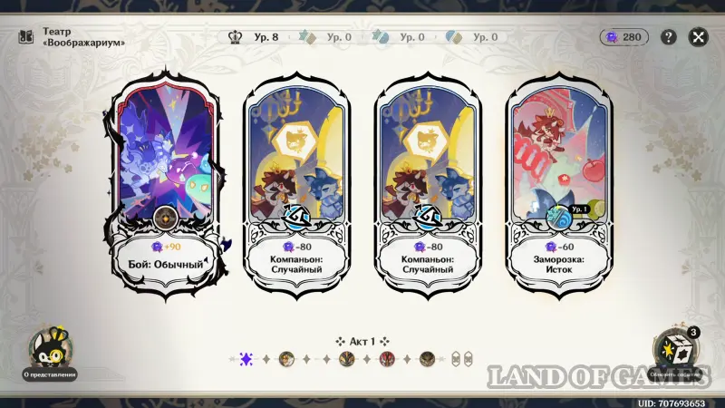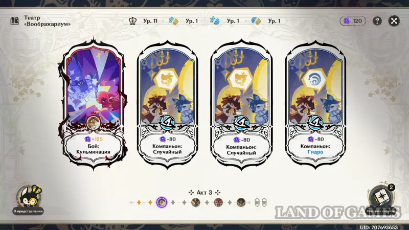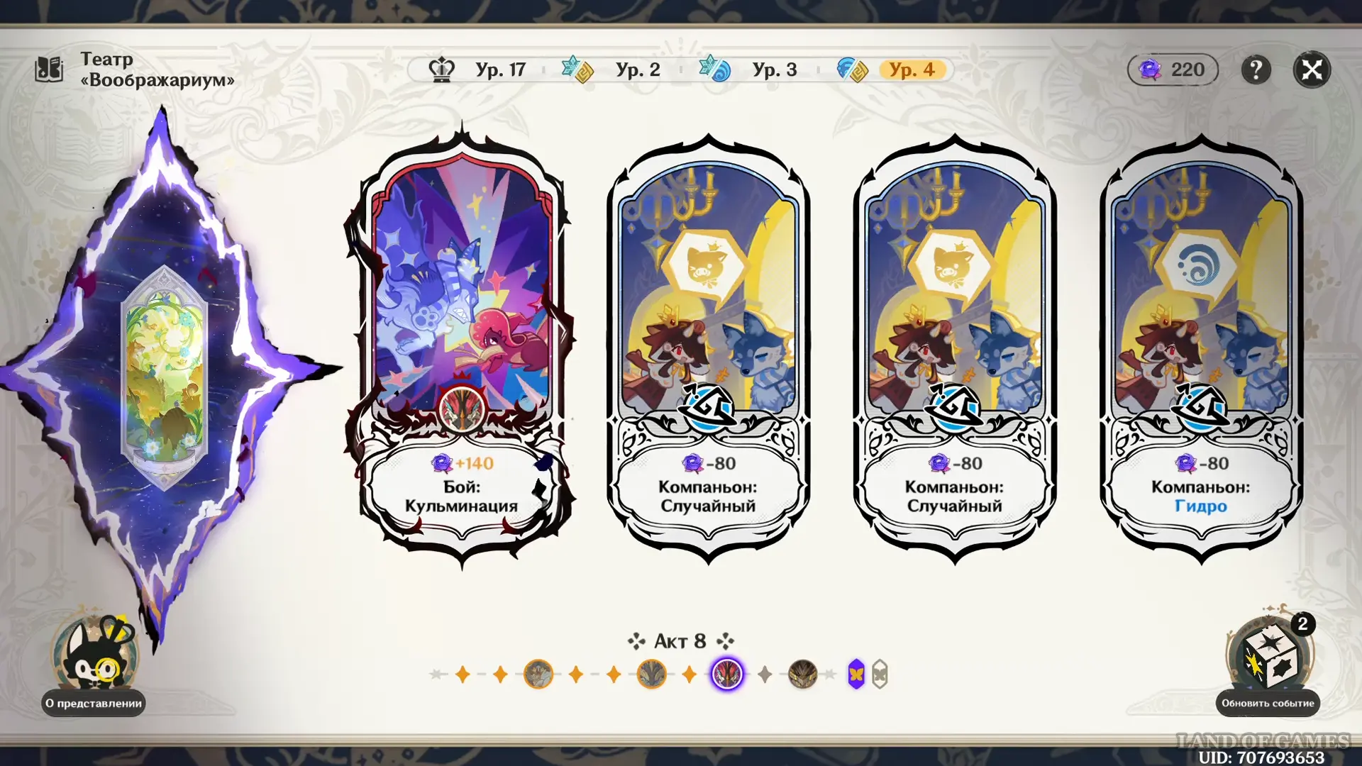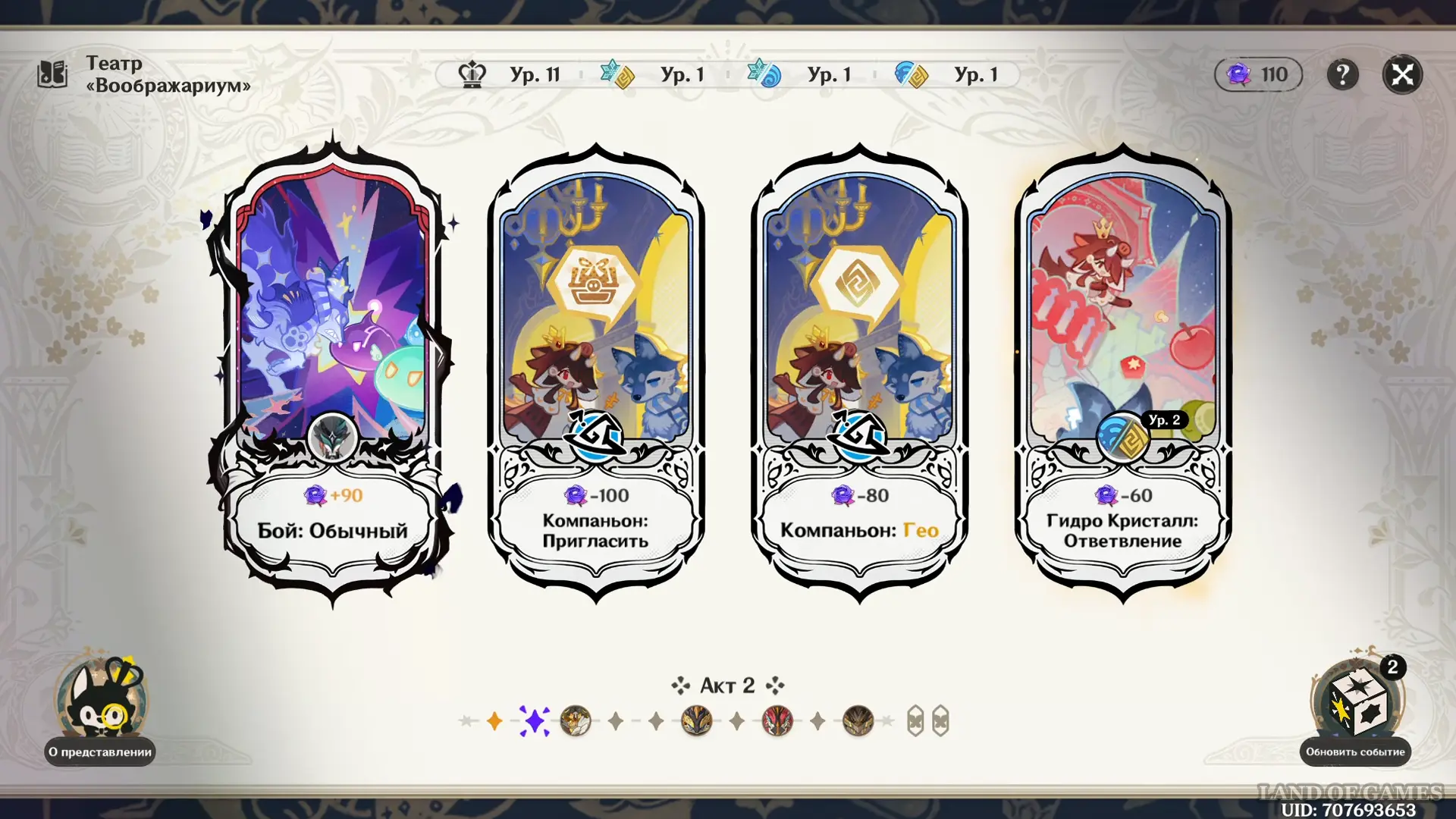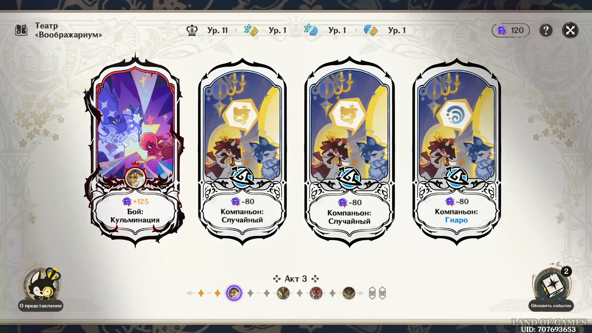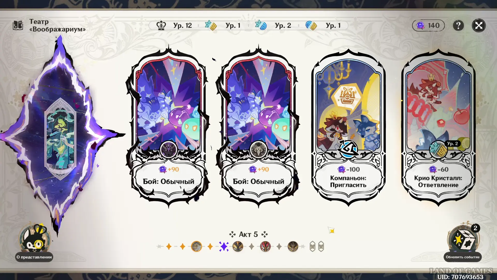 Если гидро героев не много (и при этом есть хиллеры), то в боях второго акта выбирайте не фантазмов и големов, а схватку с Фатуи — оба варианта предполагают победу над 4-я врагами, но второй не требователен к стихиям основных ДД отряда.