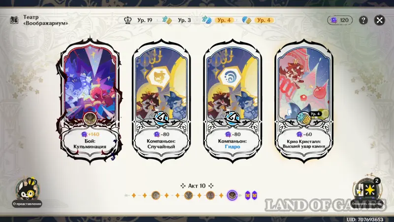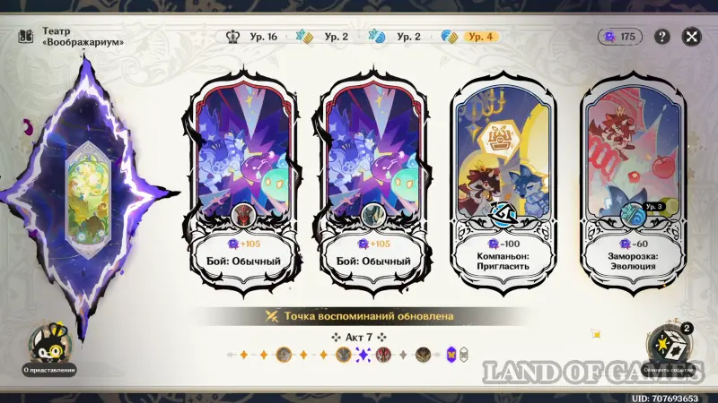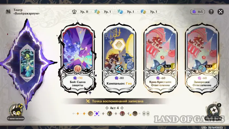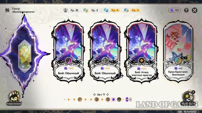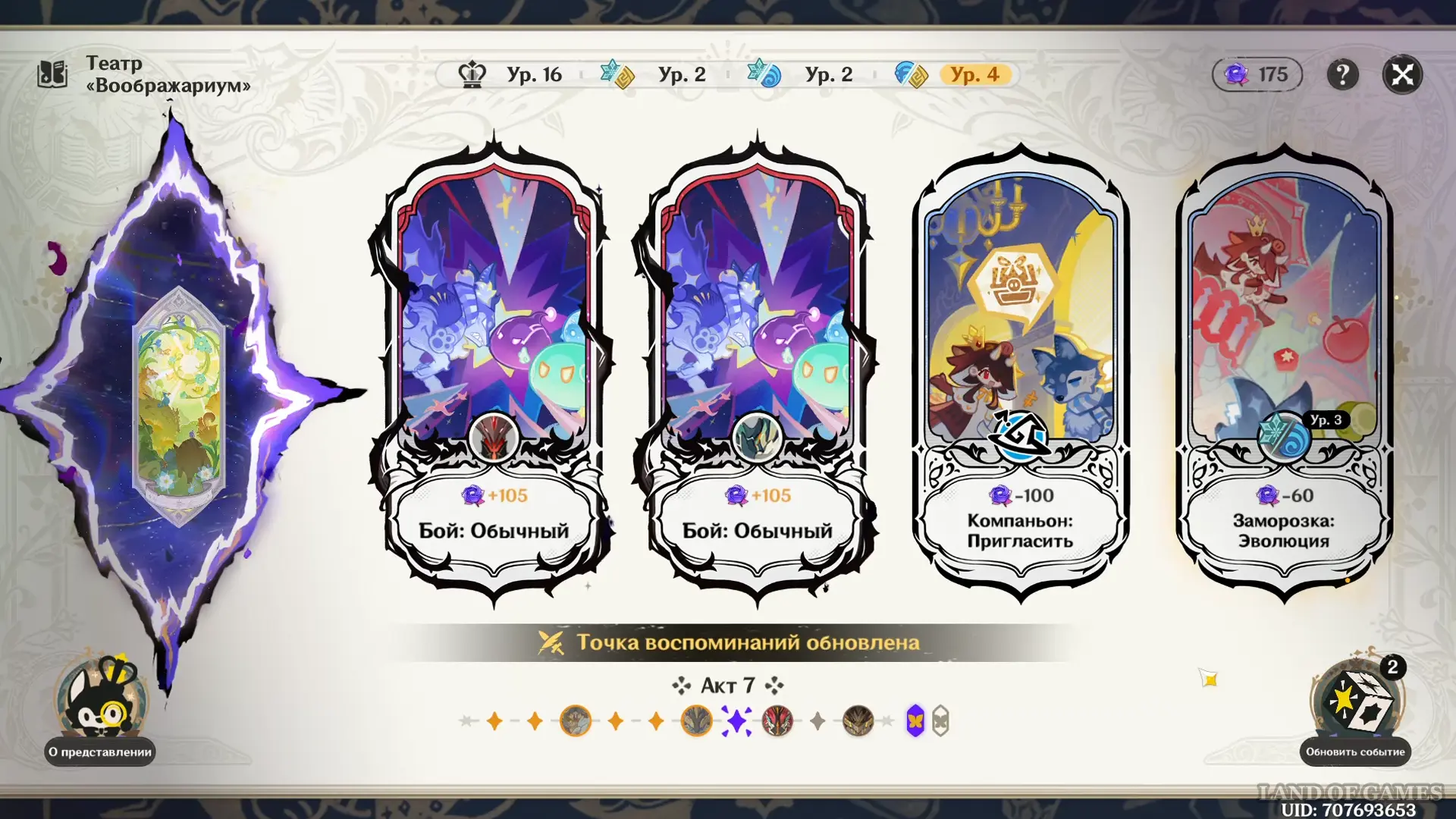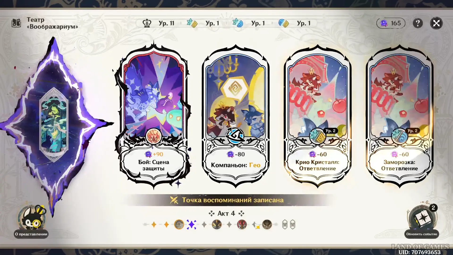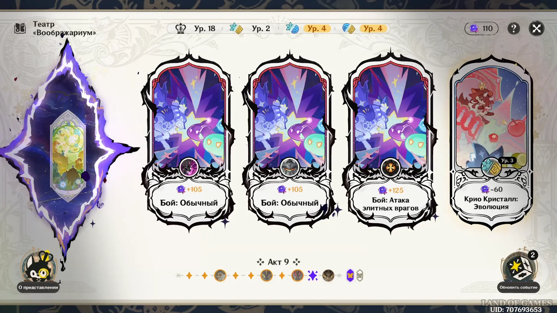 В игре появился отдельный раздел ачивок под данный режим, поделенный на несколько частей. Для их открытия нужно выполнять определенные условия в «Театре Воображариум». За разблокировку ачивок помимо камней истока вы будете получать уникальные именные карты. Далее мы перечислим все имеющиеся на данный момент трофеи и расскажем, как их можно получить.