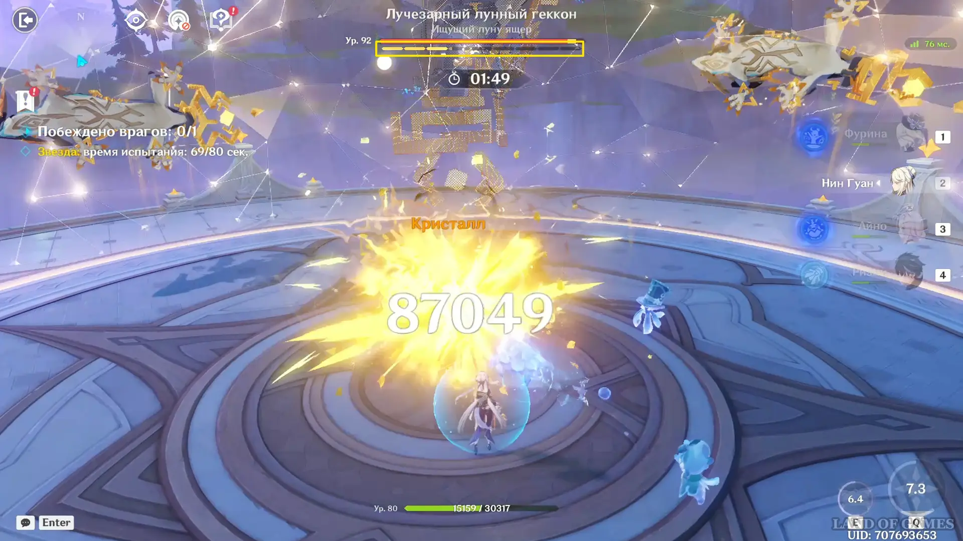 - Сцена 6: Лучезарный лунный геккон. Оставьте для боя гео персонажа (т.е отряд под более прокаченное благословение гео-гидро или гео-крио), который сможет быстро разрушить купол с 6-и-уровневым щитом;