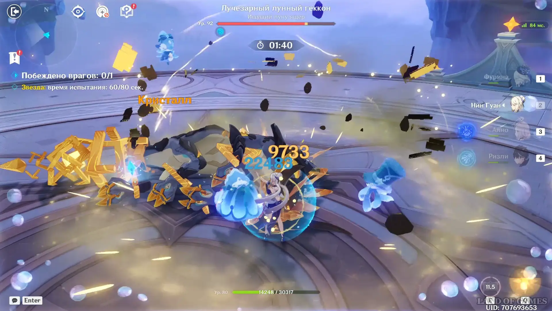 В начале боя Лунный геккон активирует состояние «Шаг в пустоту»: над полем появляется купол с клонами, а сам геккон перемещается по воздуху и периодически атакует. Ваша главная цель — как можно быстрее уничтожить золотой тотем в центре; особенно эффективно сочетание гео с любым элементом, создающим множество кристаллов. После разрушения шести щитов монстр падет на землю, и вы сможете атаковать его в состоянии оглушения.